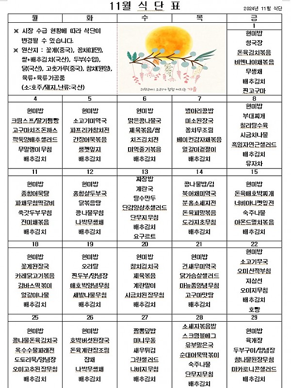 2024년 11월 식단표 ^^ 페이지 정보 작성자 관리자 작성일24-10-31 13:19 조회1,405회 댓글0건 이전글 다음글 목록 본문 힘차게 달리다 보니 벌써 11월이 되었습니다. 11월에도 맛있게 먹고 힘내서 열심히 일하겠습니다. ^^ 이전글 다음글 목록