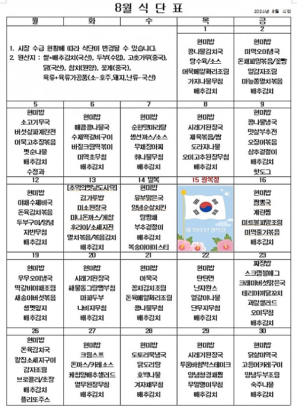2024년 8월 식단표 ^^ 페이지 정보 작성자 관리자 작성일24-07-29 15:07 조회1,857회 댓글0건 이전글 다음글 목록 본문 더워도 너무 무더운 날씨로 많이 힘들지만 맛있게 먹고 힘 내서 8월도 열심히 달리겠습니다! ^^ 이전글 다음글 목록