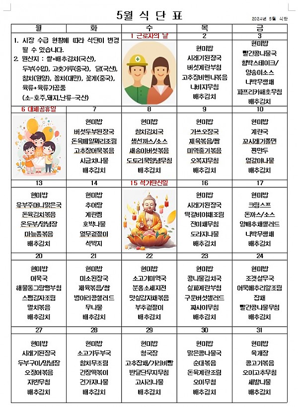 2024년 5월 식단표 ^^ 페이지 정보 작성자 관리자 작성일24-04-30 09:03 조회2,473회 댓글0건 이전글 다음글 목록 본문 5월에도 건강한 음식을 맛있게 먹고 힘내서 열심히 일하겠습니다! ^^ 이전글 다음글 목록