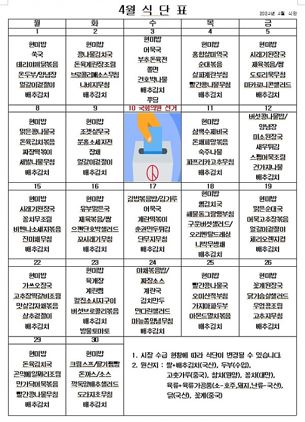 2024년 4월 식단표 ^^ 페이지 정보 작성자 관리자 작성일24-03-29 09:28 조회2,512회 댓글0건 이전글 다음글 목록 본문 푸르른 4월에도 맛있게 먹고 힘 내서 열심히 일하겠습니다! 이전글 다음글 목록