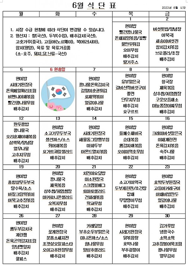 2023년 6월 식단표 ^^ 페이지 정보 작성자 관리자 작성일23-06-05 14:21 조회3,010회 댓글0건 이전글 다음글 목록 본문 무더운 여름이 찾아왔습니다. 덥지만 맛있게 먹고 힘내서 싱그러운 6월을 잘 보내겠습니다. ^^ 이전글 다음글 목록