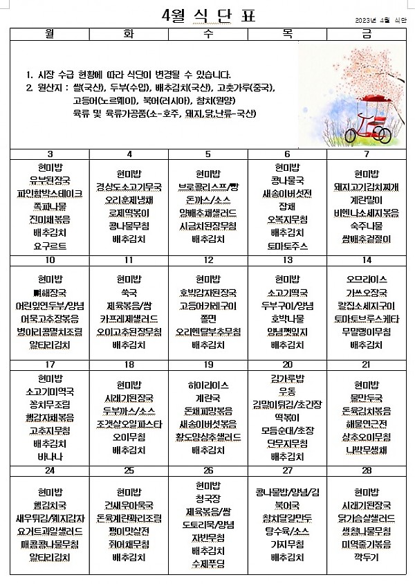 2023년 4월 식단표 ^^ 페이지 정보 작성자 관리자 작성일23-03-30 15:59 조회3,019회 댓글0건 이전글 다음글 목록 본문 자조모임 의견에서 나온 희망 식단, 희망 간식을 최대한 반영해보려고 했습니다. ^^ 4월에도 맛있게 먹고 힘 냅시다! 이전글 다음글 목록