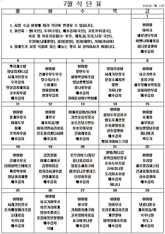 2022년 7월 식단표 ^^ 페이지 정보 작성자 관리자 작성일22-07-14 09:28 조회3,112회 댓글0건 이전글 다음글 목록 본문 무더운 여름이지만 식중독 발생에 주의하면서 맛있고 안전한 식단을 제공하도록 노력하겠습니다. 이전글 다음글 목록