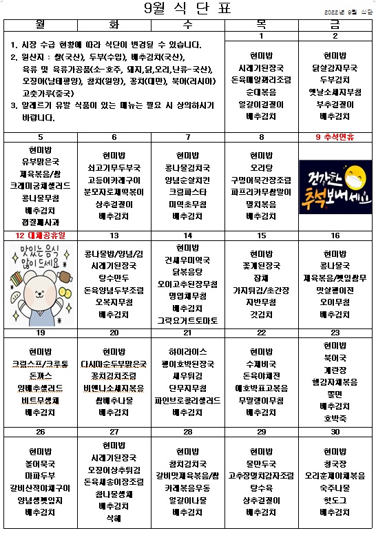 2022년 9월 식단표 ^^ 페이지 정보 작성자 관리자 작성일22-08-30 18:35 조회3,099회 댓글0건 이전글 다음글 목록 본문 보름달처럼 둥근 마음으로 풍성한 식단을 준비했습니다. 맛있게 먹고 모두의 건강을 지킬 수 있도록 열심히 노력하겠습니다. ^^ 이전글 다음글 목록