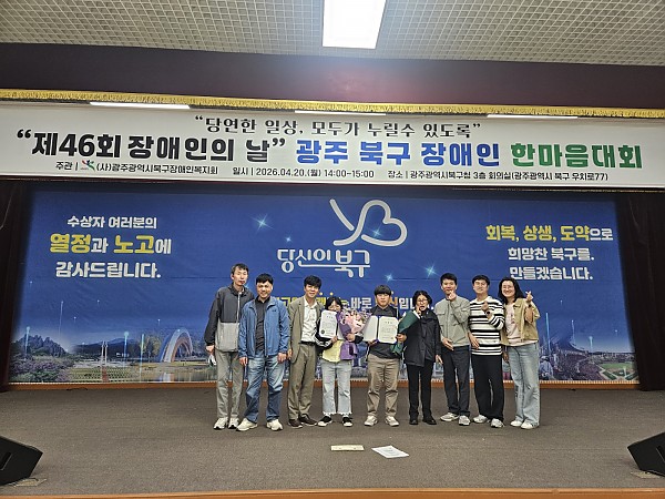 제46회 장애인의날 수상 페이지 정보 작성자 관리자 작성일26-04-20 17:23 조회10회 댓글0건 다음글 목록 본문 제46회 장애인의날을 맞이하여 센터 이용인 두분이 북구청장상, 북구의회의장상을 받으셨습니다. 많은 축하바랍니다. 다음글 목록