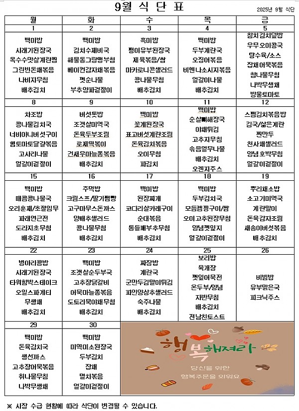 2025년 9월 식단표 ^^ 페이지 정보 작성자 관리자 작성일25-08-28 18:17 조회306회 댓글0건 이전글 다음글 목록 본문 처서가 지났지만 아직 무더위가 기승을 부리고 있습니다. 9월에도 맛있게 먹고 힘내서 즐겁게 일하겠습니다. 이전글 다음글 목록