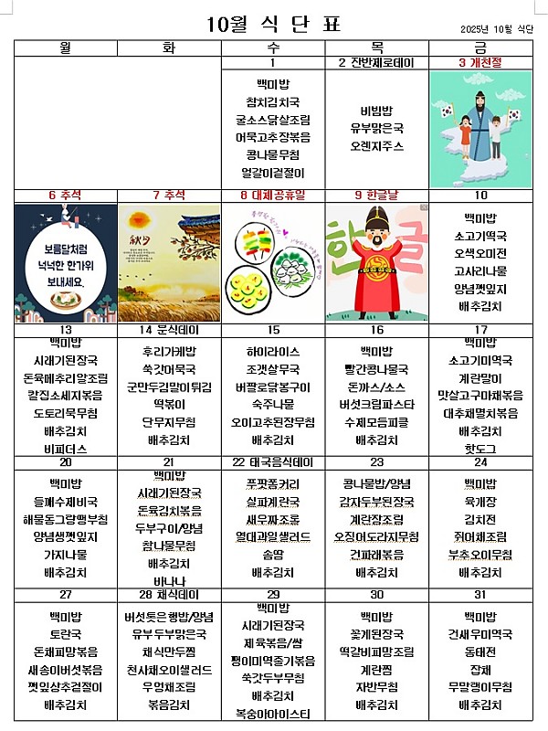 2025년 10월 식단표 ^^ 페이지 정보 작성자 관리자 작성일25-09-30 08:53 조회165회 댓글0건 이전글 다음글 목록 본문 10월에는 이용인 자조모임 희망 식단, 희망 간식을 최대한 반영하고, 잔반제로데이, 분식데이, 태국음식데이, 채식데이를 선정하여 보다 다채로운 음식을 제공해드리려고 합니다. 맛있게 먹고 열심히 일하겠습니다. ^^ 이전글 다음글 목록