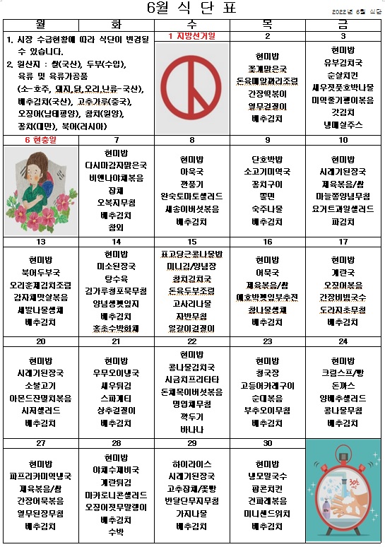 2022년 6월 식단표 ^^ 페이지 정보 작성자 관리자 작성일22-05-31 15:04 조회3,145회 댓글0건 이전글 다음글 목록 본문 더욱 알차고 맛있는 식단을 제공하도록 노력하겠습니다. ^^ 이전글 다음글 목록