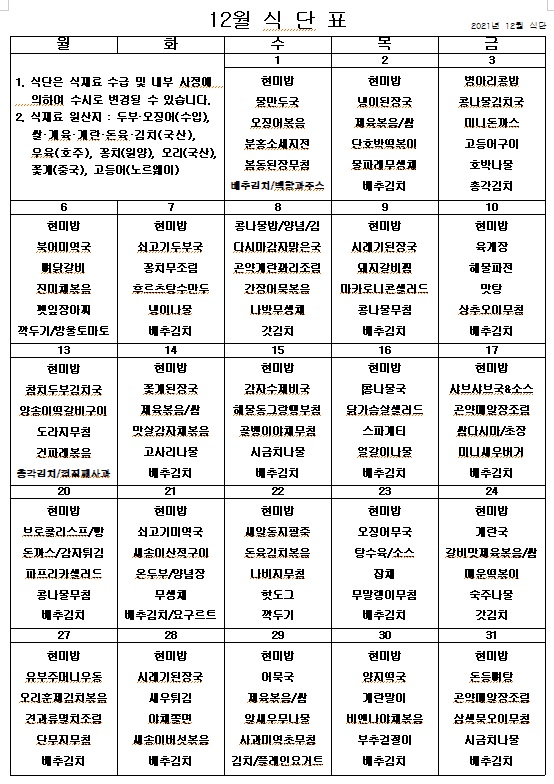2021년 12월 식단표 ^^ 페이지 정보 작성자 관리자 작성일21-11-30 09:10 조회3,431회 댓글0건 이전글 다음글 목록 본문 어느덧 연말이 코 앞이네요. 맛있게 먹고 건강하게 지내면서 위드 코로나 시대를 현명하게 잘 이겨내봐요! ^^ 이전글 다음글 목록