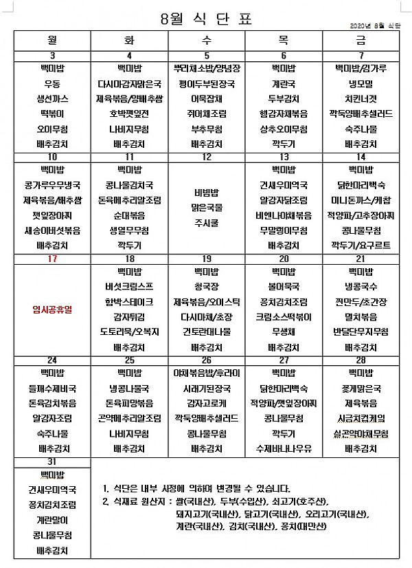 8월 식단표 페이지 정보 작성자 관리자 작성일20-08-13 16:09 조회3,943회 댓글0건 이전글 다음글 목록 본문 맛있게 먹고 힘내요! ^^ 사회적 거리 두기 1단계. 이전글 다음글 목록