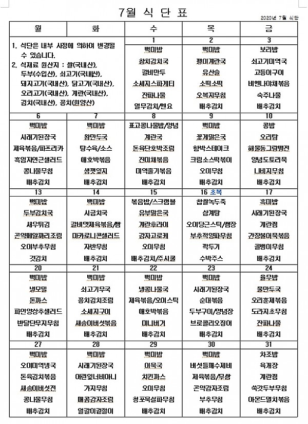 2020년 7월 식단 ^^ 페이지 정보 작성자 관리자 작성일20-06-30 17:27 조회3,903회 댓글0건 이전글 다음글 목록 본문 코로나바이러스가 우리 주변에도 서성이고 있어서 무섭습니다. 그래도 맛있게 먹고 화이팅! ^^ 이전글 다음글 목록