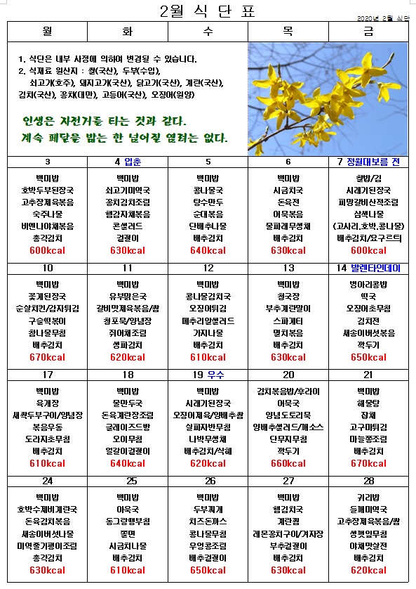 2020년 2월 식단표 페이지 정보 작성자 관리자 작성일20-02-03 19:04 조회4,131회 댓글0건 이전글 다음글 목록 본문 즐거운 점심시간 ^^ 맛있는 음식으로 활기찬 하루를 보내요! 이전글 다음글 목록