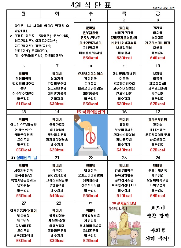 2020년 4월 식단 페이지 정보 작성자 관리자 작성일20-04-01 18:28 조회4,240회 댓글0건 이전글 다음글 목록 본문 코로나 바이러스를 잘 이겨냅시다! 사회적 거리 두기 실천 식후 식당 방역 소독 철저 이행 이전글 다음글 목록