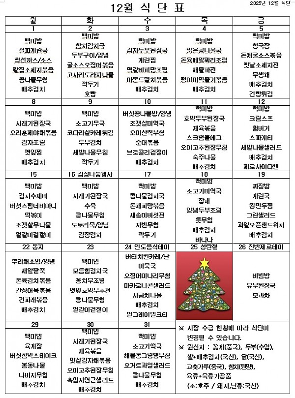2025년 12월 식단표 ^^ 페이지 정보 작성자 관리자 작성일25-11-27 21:11 조회999회 댓글0건 이전글 다음글 목록 본문 12월에도 맛있게 먹고 건강한 마음으로 열심히 일해보겠습니다. ^^ 이전글 다음글 목록