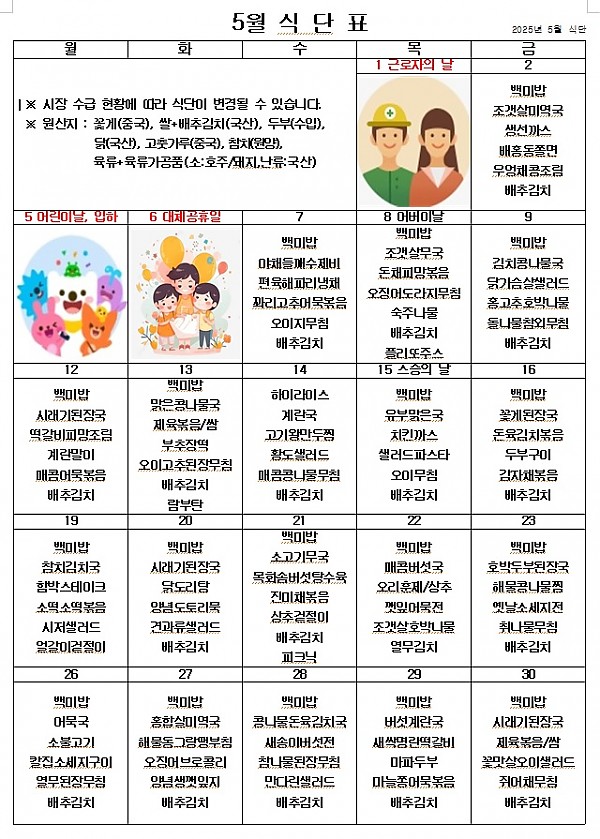 2025년 5월 식단표 ^^ 페이지 정보 작성자 관리자 작성일25-04-29 15:51 조회646회 댓글0건 이전글 다음글 목록 본문 여름같이 더운 5월입니다. 5월에도 맛있게 먹고 힘 내서 열심히 일하겠습니다! ^^ 이전글 다음글 목록