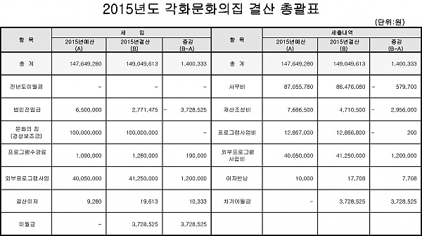 2015년 각화문화의집 결산 공고 페이지 정보 작성자 배지연 작성일16-02-17 15:50 조회8,543회 댓글0건 이전글 다음글 목록 본문 2015년 각화문화의집 결산을 공고 합니다. 이전글 다음글 목록