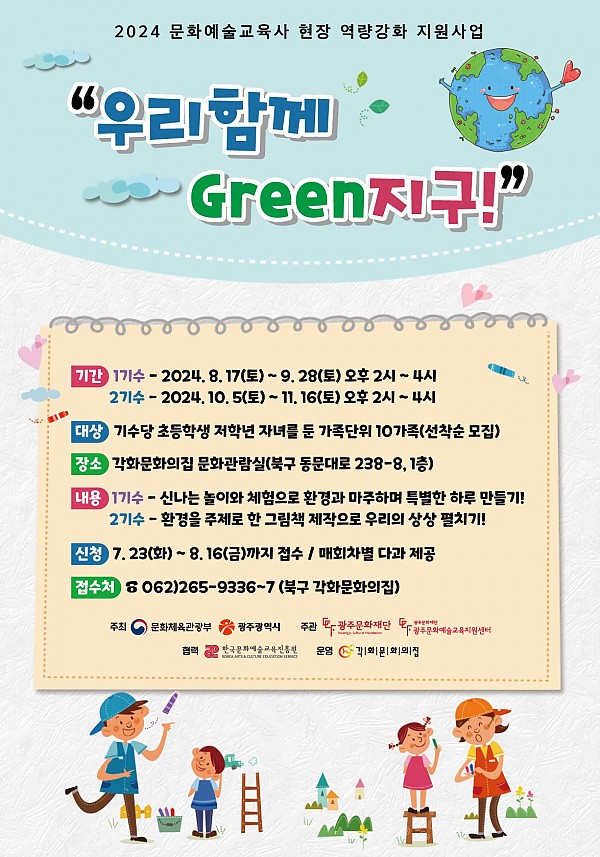 각화문화의집 '우리함께 Green지구!' 프로그램 참여자 모집 페이지 정보 작성자 정관용 작성일24-08-01 17:58 조회3,146회 댓글0건 이전글 다음글 목록 본문 '우리함께 Green지구!' 프로그램 참여자 모집 많은 참여 바랍니다! 이전글 다음글 목록