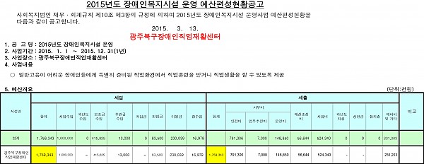 2015년 광주북구장애인직업재활센터 세입세출(예산) 공고 페이지 정보 작성자 배지연 작성일15-03-13 17:44 조회12,800회 댓글0건 이전글 다음글 목록 본문 사회복지법인 재무회계규칙 제10조 제3항의 규정에 의하여 2015년도 장애인복지시설 운영사업 예산편성현황을 다음과 같이 공고합니다. 이전글 다음글 목록