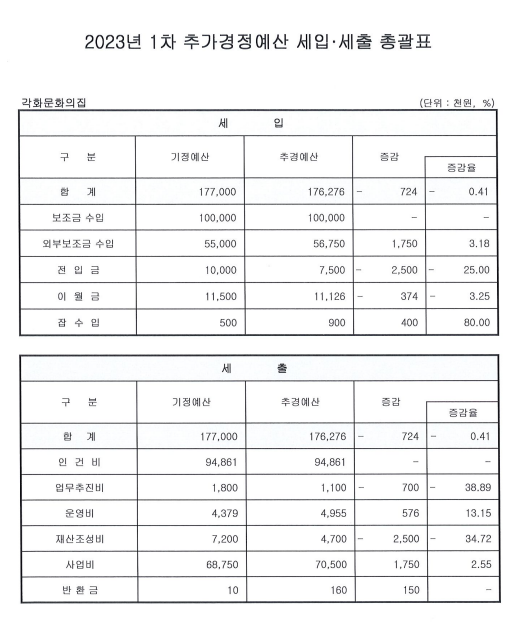 2. 공고사항 : 2023 각화문화의집 1차 추가경정 세입·세출 예산서