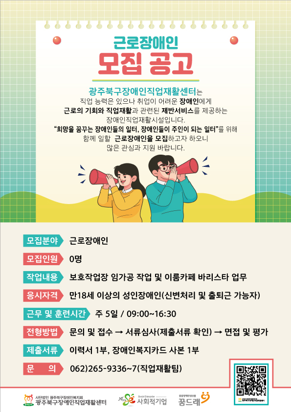 근로장애인 모집공고 페이지 정보 작성자 관리자 작성일23-03-07 09:53 조회10,526회 댓글0건 이전글 다음글 목록 본문 - 함께 근무할 근로장애인을 모집 합니다. - 모집 공고를 보시고 관심있는 분은 연락주시면 감사하겠습니다. (미싱 가능자 우대) 이전글 다음글 목록