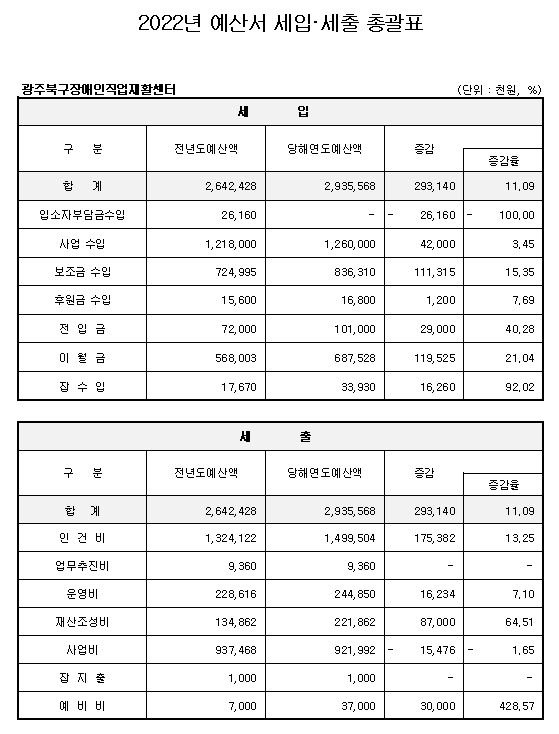 2022 광주북구장애인직업재활센터 세입·세출 예산서 공고