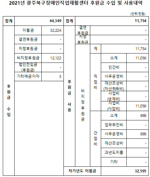 2021 광주북구장애인직업재활센터 후원금 수입 및 사용내역 페이지 정보 작성자 관리자 작성일22-03-24 10:30 조회13,878회 댓글0건 이전글 다음글 목록 본문 사회복지법인 및 사회복지시설 재무․회계규칙 제41조의 6의 규정에 의거하여 2021 광주북구장애인직업재활센터 후원금 수입 및 사용 내역을 다음과 같이 공개합니다. 이전글 다음글 목록