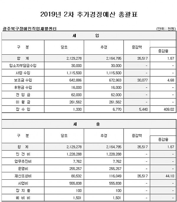 2019 광주북구장애인직업재활센터 2차 추가경정 세입세출(예산) 공고