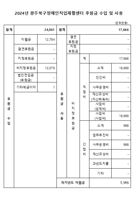 2024년 광주북구장애인직업재활센터 후원금 수입 및 사용내역 공고 페이지 정보 작성자 관리자 작성일25-03-11 16:06 조회5,475회 댓글0건 이전글 다음글 목록 본문 사회복지법인 및 사회복지시설 재무․회계규칙 제41조의 6의 규정에 의거하여 2024년 광주북구장애인직업재활센터 후원금 수입 및 사용 내역을 다음과 같이 공개합니다. 이전글 다음글 목록