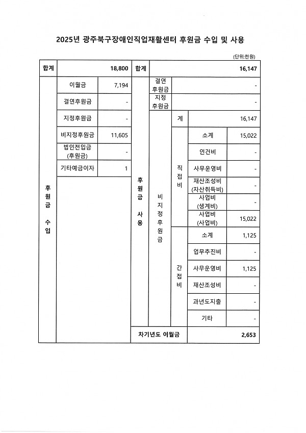 2025년 광주북구장애인직업재활센터 후원금 수입 및 사용내역 공고 페이지 정보 작성자 관리자 작성일26-03-04 17:01 조회2,800회 댓글0건 이전글 다음글 목록 본문 사회복지법인 및 사회복지시설 재무․회계규칙 제41조의 6의 규정에 의거하여 2025년 광주북구장애인직업재활센터 후원금 수입 및 사용 내역을 다음과 같이 공개합니다. 이전글 다음글 목록